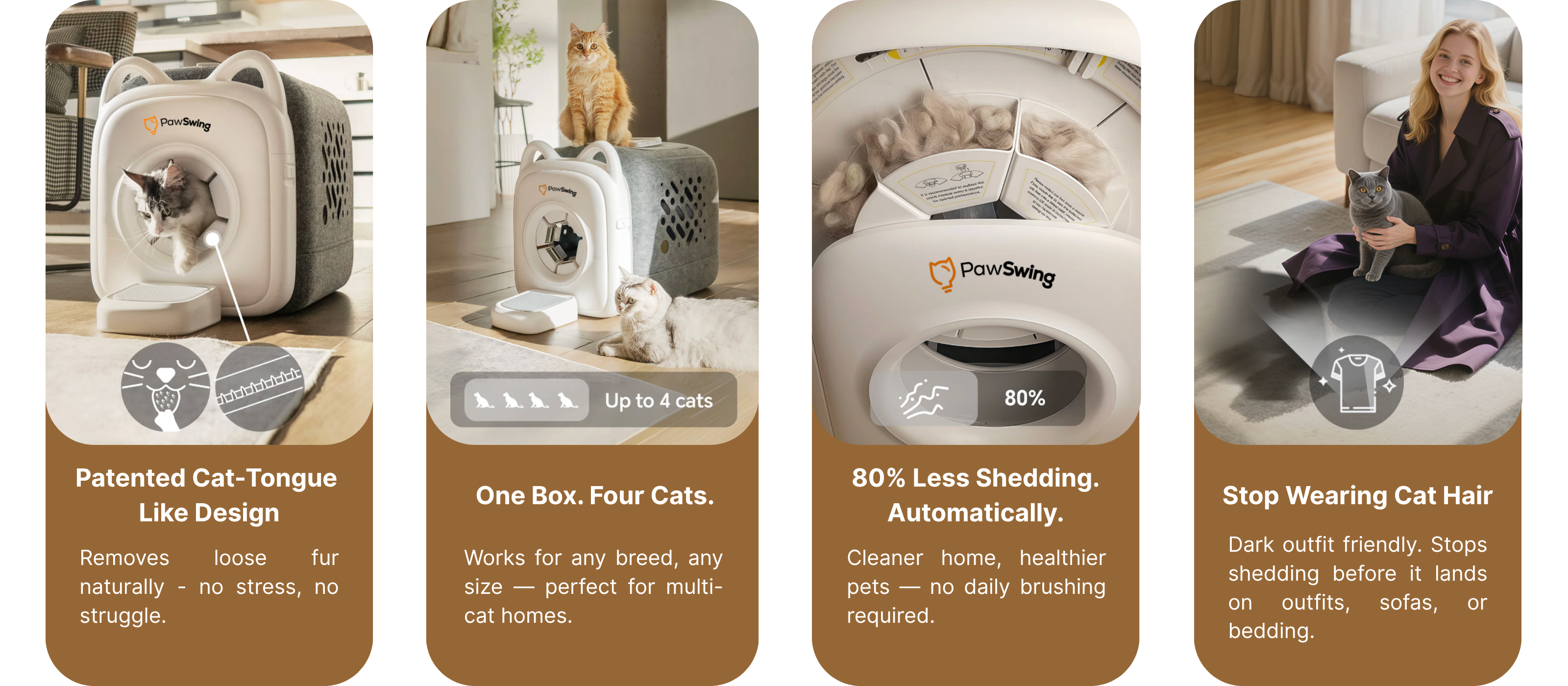 Engineered to mimic the natural grooming motion of a cat’s tongue, PawSwing Pro uses flexible comb modules that compress and smooth the undercoat — just like real feline papillae.